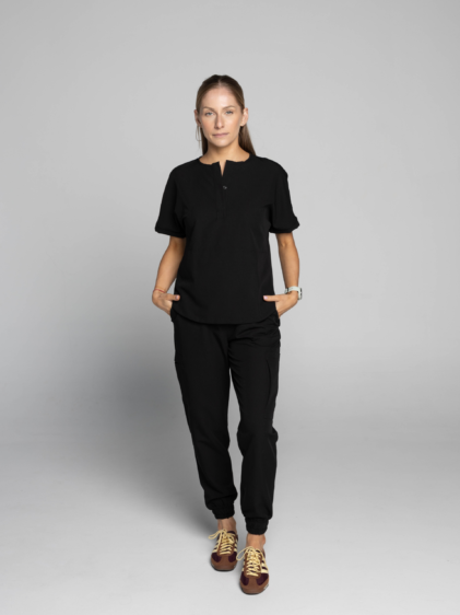 Bluza damska kierowana do tych kobiet, które poszukują wyjątkowego fasonu, w którym poczują się luźno i wygodnie. Uszyta w kroju z długim dekoltem zapinanym na guzik i wydłużanym tyłem bluzy.