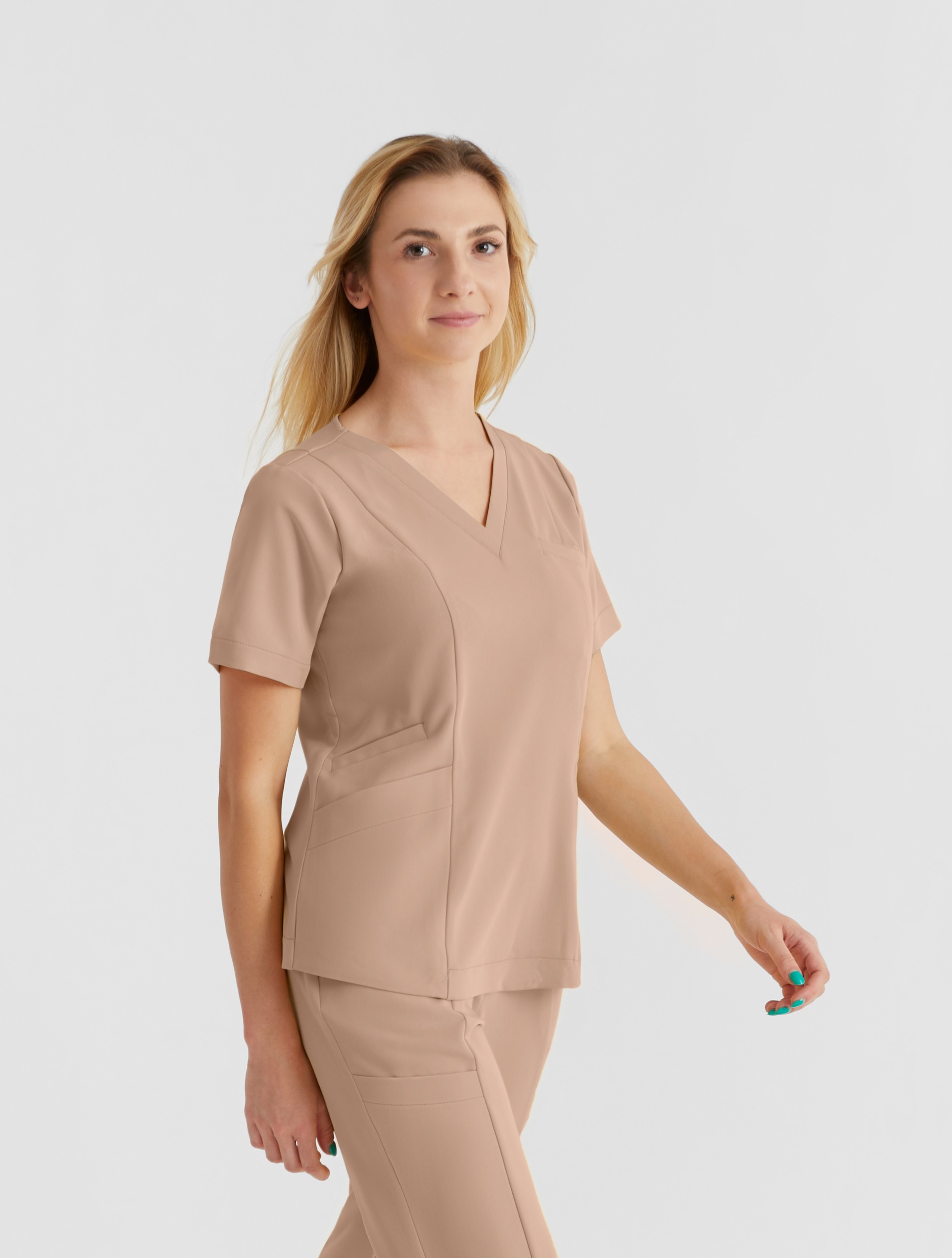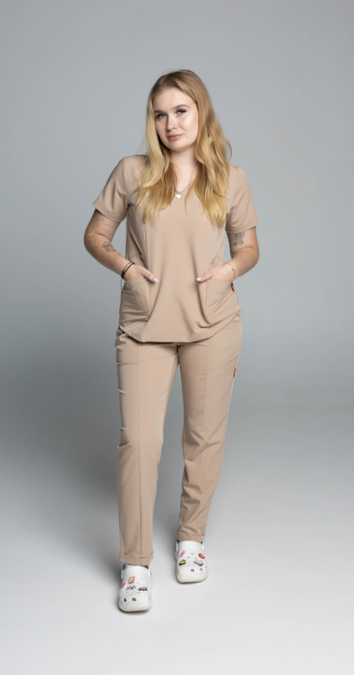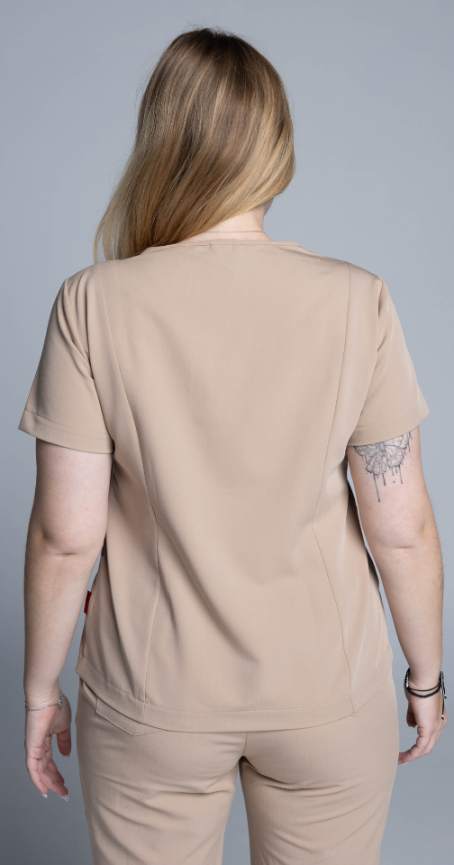 Bluza damska kierowana do tych kobiet, które chcą czuć się w scrubsach swobodnie. Uszyta w kroju wyszczuplającym. Delikatny kolor kawowy - latte.
